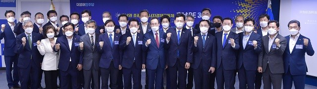 | ▲ 이용섭 광주광역시장(앞줄 우측부터 4번째)이 31일 오후 서울 여의도 더불어민주당 중앙당사에서 열린 '호남 초광역 에너지경제공동체(호남 RE300) 프로젝트' 용역 결과보고회에 참석해 더불어민주당 송영길 당대표를 비롯한 당 지도부와 호남지역 더불어민주당 의원, 김영록 전남지사, 송하진 전북지사, 문승욱 산업통상자원부 장관 등 참석자들과 기념촬영을 하고 있다./광주광역시 제공 |