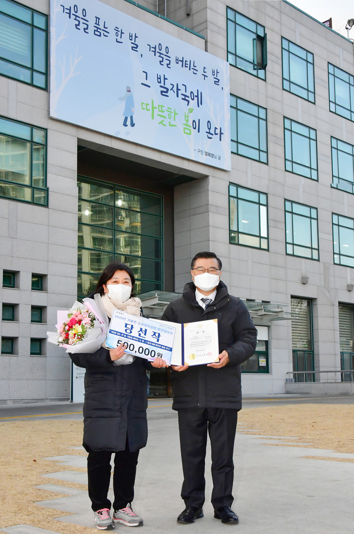 중랑구가 중랑행복글판 겨울편을 중랑구청사 외벽에 게시하고 최근 공모 시상식을 개최했다. 사진은 중랑행복글판 겨울편 공모 시상식에서 류경기 구청장(오른쪽)과 당선작 수상자 엄혜경씨가 기념촬영을 하는 모습. (사진제공=중랑구청)