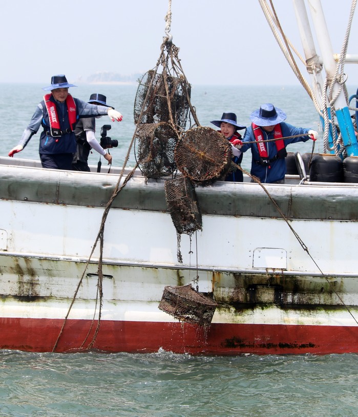 수산업협동조합중앙회 주최로 2일 충남 보령시 대천해수욕장 앞바다에서 열린 '충청어업인 휴어기 침적 쓰레기 대청소' 행사에서 수협 직원과 어업인들이 바닷속에 있는 폐통발을 수거하고 있다.