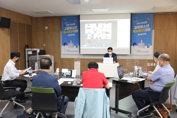 강동구가 개최한 ‘강동구청장배 강동청소년 독서토론대회’가 지난 28일 결승전을 끝으로 성황리에 막을 내렸다. 이번 대회는 논술(개인전)과 토론(단체전) 등 두 가지 분야로 나눠 참가자를 모집했고, 중·고생 총 60여명이 참가했다. 사진은 이정훈 구청장(가운데)이 참가한 가운데 독서토론대회 결승전이 진행되고 있는 모습.(사진제공=강동구청)