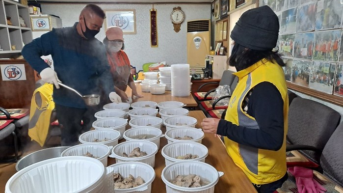 경기 동두천시 소요동 행정복지센터는 최근 지역내 홀몸노인 등 취약계층 60가구에 닭곰탕을 전달했다. 매월 1회 마니커에서 생닭 100kg을 후원하고 있으며, 로컬드림봉사회에서 직접 조리해 반찬지원서비스를 실시하고 있다. 사진은 봉사자들이 음식을 포장하고 있는 모습. (사진제공=동두천시청)