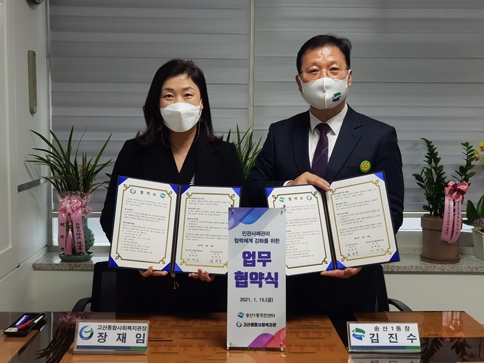 경기 의정부시 송산1동 주민센터와 의정부시고산종합사회복지관은 최근 지역내 복지사각지대 제로(Zero)를 위한 업무협약을 체결하고, 위기가정 발굴 및 상담 등을 협력하기로 했다. 사진은 협약 체결 후 김진수 송산1동장과 장재임 관장이 기념촬영을 하는 모습. (사진제공=의정부시청)
