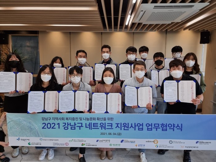 서울 강남복지재단은 최근 지역내 14개 사회복지기관과 정보공유 등을 위한 네트워크를 구성하는 업무협약을 체결했다. 이번 협약으로 각 기관은 복지자원의 발굴과 공유 등 여러 분야에서 분기별로 협력사업을 추진하며, 재단은 사업추진을 위한 사업비 1000만원을 지원한다. 사진은 협약식에서 관계자들이 기념촬영을 하는 모습. (사진제공=강남복지재단)