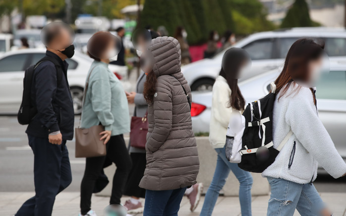 서울 아침 최저기온이 6.6도로 올해 가을 들어 가장 추운 날씨를 보인 15일 오전 서울 종로구 세종로네거리에서 시민들이 출근길을 서두르고 있다.
