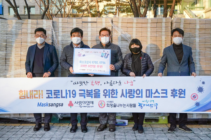 서울 동대문구가 7일 교육·복지 공익법인 (사)희망을 나누는 사람들로부터 코로나19 극복을 위한 마스크 19만8000매(1억원 상당)를 전달 받았다. 이날 기탁 받은 마스크는 각 부서 및 동 주민센터를 통해 지역내 취약계층에게 배부된다. 사진은 마스크를 전달 받은 유덕열 구청장(가운데)이 김정안 대표 및 관계자들과 기념촬영을 하는 모습. (사진제공=동대문구청)