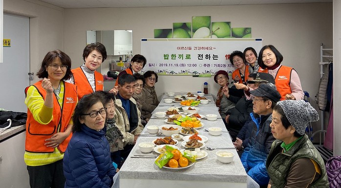 인천 서구 가좌2동 지역사회보장협의체는 최근 공유부엌에 지역내 홀몸노인 10여명을 초대해 정성스럽게 준비한 음식을 대접했다. 이날 노인들과 위원들은 함께 점심식사를 한 후 담소를 나눴다. 사진은 식사 전 함께 기념촬영을 하는 모습. (사진제공=서구청)
