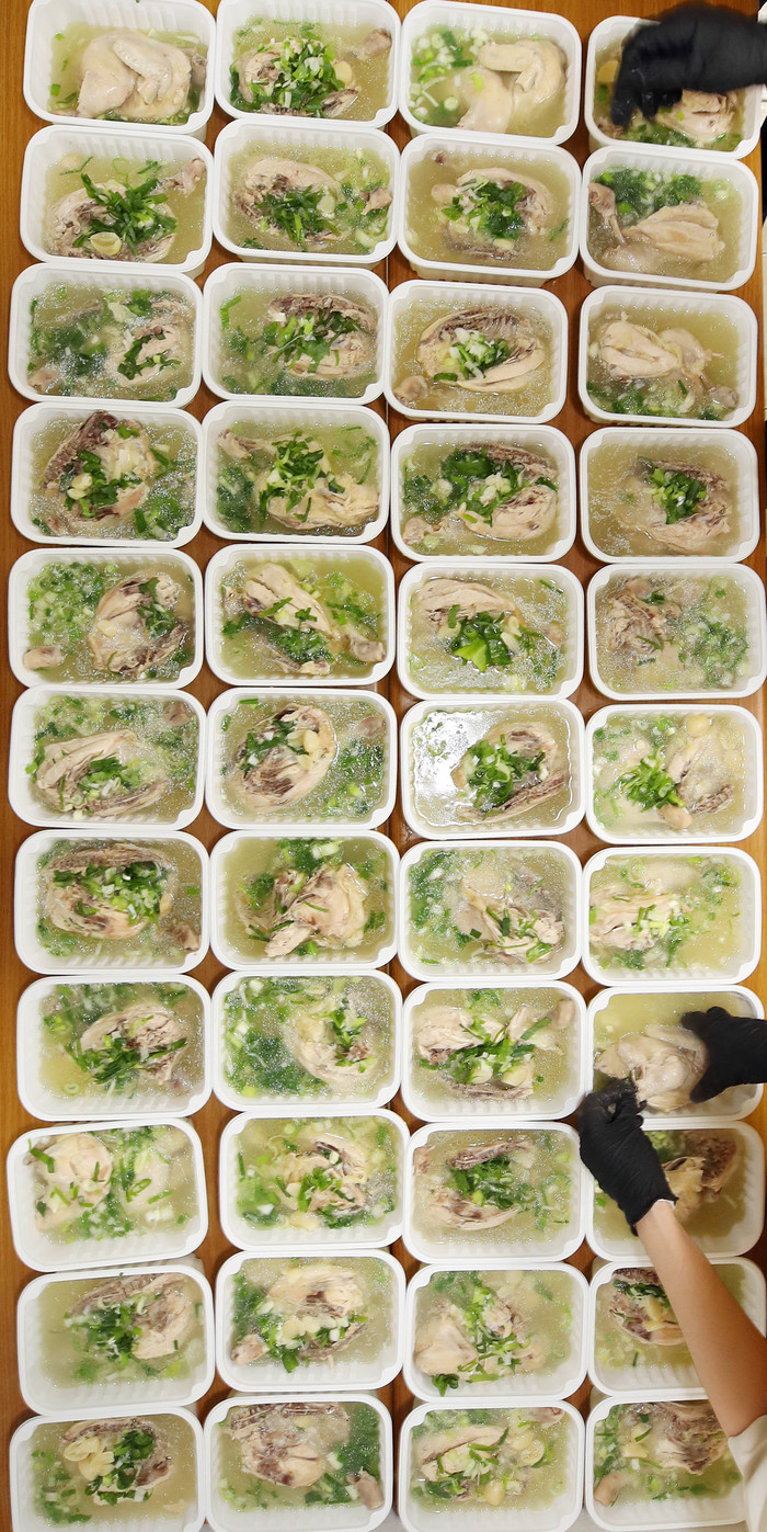 5일 대구 수성구 지산종합사회복지관에서 봉사자들이 지역내 장애인과 노인 350여명에게 전달할 초복 맞이 삼계탕을 포장하고 있다. 수성구청은 코로나19 확산 예방을 위해 개별포장한 삼계탕을 워킹스루 방식으로 전달한다고 밝혔다.
