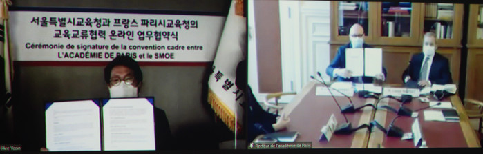 조희연 서울시교육감과 크리스토프 케레로 프랑스 파리시교육감이 26일 오후 서울시교육청에서 교육 교류 및 협력을 위한 온라인 업무협약을 체결하고 있다.