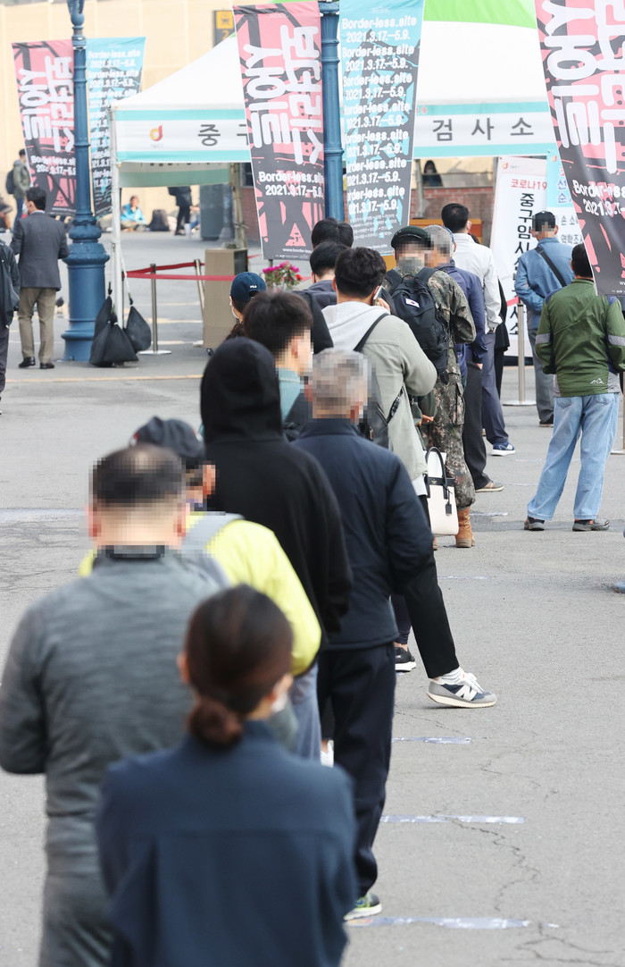 코로나19 신규 확진자 수가 668명을 기록한 7일 오전 서울역 코로나19 임시선별검사소에서 시민들이 검사를 위해 줄을 서 있다.