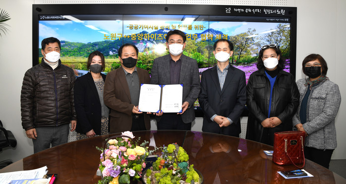 서울 노원구가 최근 중앙하이츠아쿠아와 업무협약을 체결해 ‘자기주도학지원센터’를 중앙하이츠아쿠아아파트(중계2·3동) 내 시설로 리모델링 및 이전하고 ‘노원교육플랫폼’으로 재출발하게 됐다. 사진은 협약식에서 오승록 구청장(가운데)과 관계자들이 기념촬영을 하는 모습. (사진제공=노원구청)