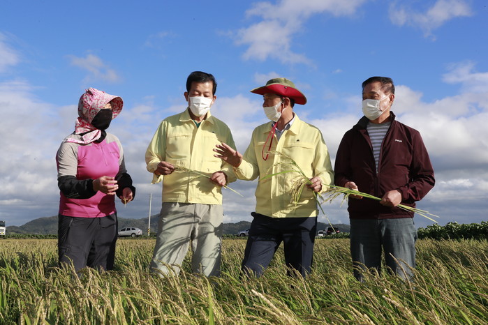 전남 보성군이 오는 12일까지 흑·백수 정밀조사를 실시할 예정이다. 벼 흑·백수 피해는 출수기 강풍으로 이삭이 검게 변색되거나, 수정이 되지 않아 이삭이 하얗게 변하는 현상이다. 사진은 7일 김철우 군수(오른쪽 두 번째)가 벼 흑·백수 피해를 입은 조성면 농가를 찾아 피해 상황 설명을 듣고 있는 모습. (사진제공=보성군청)