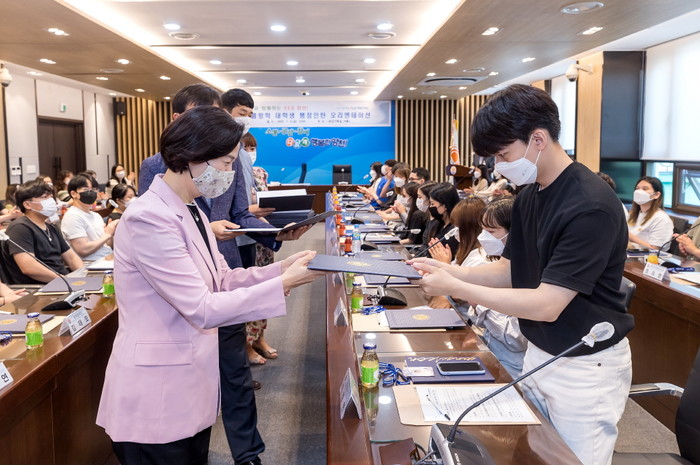 김수영 양천구청장(왼쪽)이 지난 3일 양천구청 4층 공감기획실에서 대학생 행정인턴에게 임명장을 수여하고 있다. 선발된 대학생 행정인턴은 여름방학 기간 행정 보조 및 행사 프로그램 지원 업무 등을 수행하게 된다. (사진제공=양천구청)
