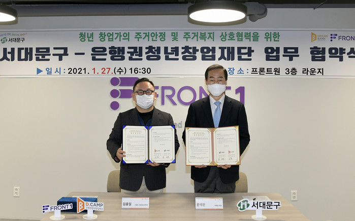 [시민일보 = 홍덕표 기자] 서대문구(구청장 문석진)가 스타트업(창업초기기업) 청년들의 주거 안정을 위해 최근 마포구 공덕동 소재 '프론트원(FRONT1)’ 3층 라운지에서 (재)은행권청년창업재단과 업무협약을 체결했다.
