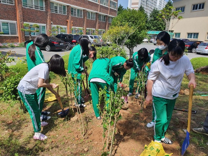 전남 순천시가 올해 입학한 학생들에게 입학기념 반려나무를 선물해 학생들과 함께 심고 관리하고 있다. 월등초, 상사초, 비봉초, 이수중, 승주중, 강남여고, 효천고 등 7개 학교 172명이 참여했다. 사진은 최근 학생들이 직접 반려나무를 식재하고 있는 모습. (사진제공=순천시청)
