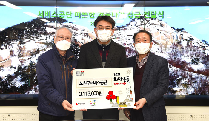 서울 노원구는 7일 노원구서비스공단으로부터 어려운 이웃을 위해 직원들이 모은 따뜻한 겨울나기 성금 311만3000원을 전달받았다. 사진은 전달식에서 오승록 구청장(가운데)이 관계자들과 기념촬영을 하고 있는 모습. (사진제공=노원구청)