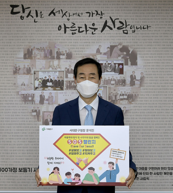 문석진 서울 서대문구청장이 27일 아동학대 예방과 복지사각지대 발굴을 위한 SNS 캠페인인 ‘SOS 릴레이 챌린지’에 참여했다. 사진은 문 구청장이 SOS 릴레이 챌린지를 하고 있는 모습. (사진제공=서대문구청)