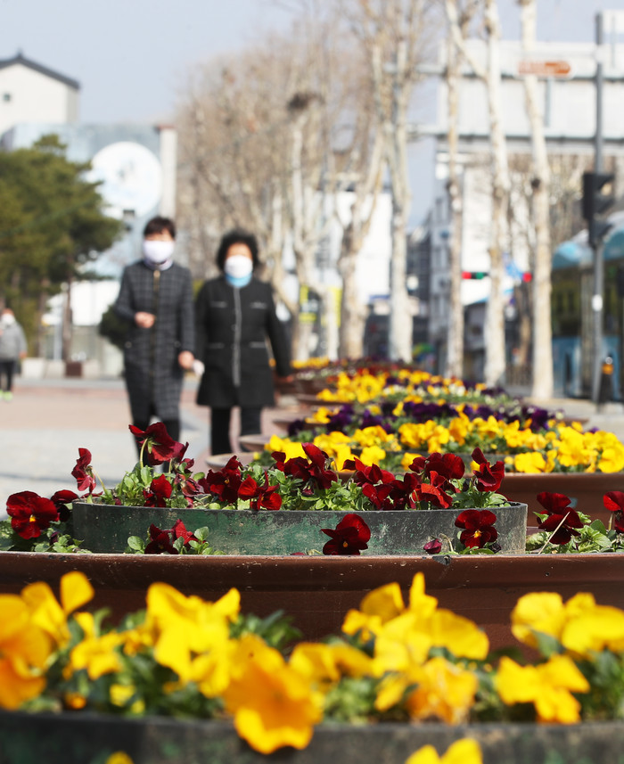3일 오전 경기 수원시 화성행궁에서 신종 코로나바이러스 감염증(코로나19) 예방을 위해 마스크를 쓴 시민들이 화단에 심어진 팬지 사이를 지나고 있다.