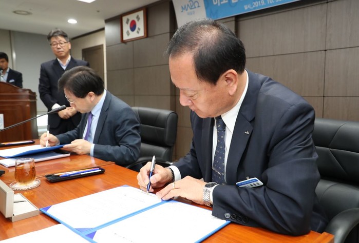 서울 마포구가 30일 구청 중회의실에서 도심제조업 활성화 및 일자리 창출을 위한 '마포 출판·인쇄 스마트앵커' 건립을 위해 서울주택도시공사와 양해각서를 체결했다. 사진은 유동균 구청장(오른쪽)과 김세용 사장이 양해각서에 서명하는 모습. (사진제공=마포구청)