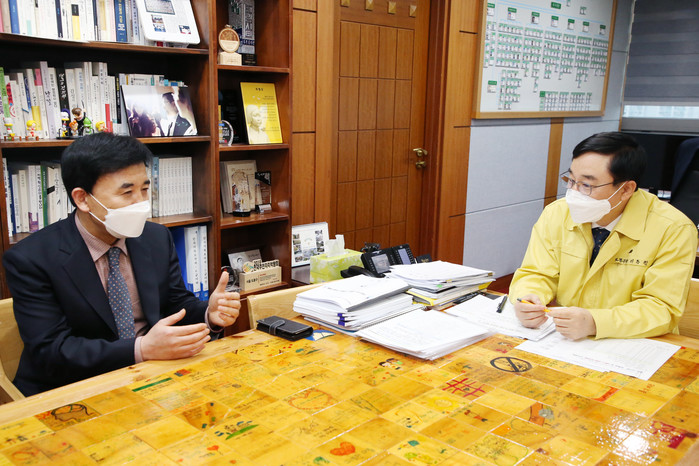 도봉구는 최근 후원기관인 ‘희망을 나누는 사람들’로부터 KF80 마스크 15만8350장, KF94 마스크 3만9350장 등 마스크 총 20만장(8000만원 상당)을 기부 받았다. 사진은 이동진 구청장(오른쪽)이 ‘희망을 나누는 사람들’ 대표인 김정안 회장과 이야기를 나누고 있는 모습. (사진제공=도봉구청)