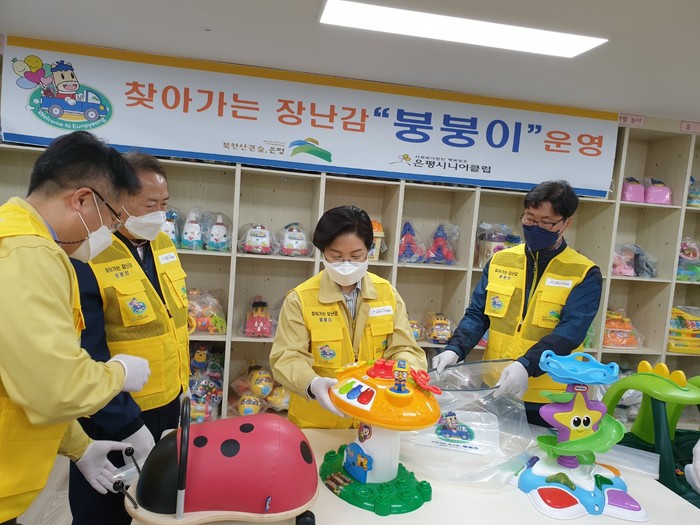 은평구가 최근 다양한 장난감을 이용할 수 있도록 영유아의 장난감을 직접 배달해 주는 찾아가는 장난감 ‘붕붕이’ 서비스의 시범운영을 마치고 본격 운영에 들어갔다. 사진은 장남감을 살펴보고 있는 김미경 구청장(오른쪽 두 번째)과 관계자들의 모습. (사진제공=은평구청)