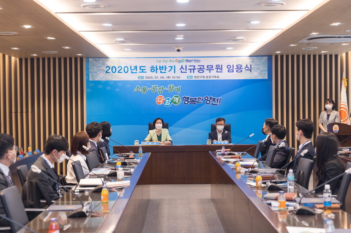 양천구는 지난 9일 4층 공감기획실에서 '2020년 하반기 신규공무원 임용식'을 열고 신규 임용자 27명에게 임용장을 수여했다. 사진은 김수영 구청장(정면 왼쪽)이 신규 임용자들에게 환영인사를 전하고 있는 모습. (사진제공=양천구청)
