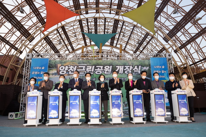양천구는 최근 ‘오래된 숲, 새로운 봄’ 이라는 테마로 대대적인 리모델링을 마치고 개방되는 '양천근린공원'의 개장식을 열었다. 사진은 양천근린공원 야외무대에서 열린 개장식에 참석한 김수영 구청장(가운데)과 관계자들이 공원 개장을 축하하고 있는 모습. (사진제공=양천구청)