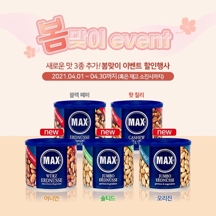 웰리브커머스 스토어 관계자는 “다양한 소비자들의 입맛을 만족시켜줄 막스키네 신제품 3종이 새롭게 출시되었다. 이달 진행되는 봄맞이 행사에서는 막스키네 5종을 할인된 가격에 구입할 수 있으니 이번 기회를 통해 독일 프리미엄 견과류 브랜드의 노하우가 담긴 막스키네를 저렴한 가격에 만나보길 바란다”고 말했다.