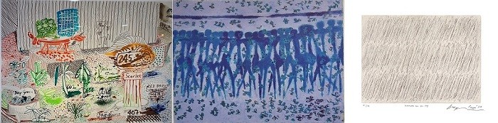 | ▲ 좌측부터, David Hockney 2019 Ink Test Image size 73.7x99.1 cm Sheet 86.4x109.2 cm Edi~, 김환기(Whanki Kim), 사월의행진(March of April), 73.5x99.5cm, oil on canvas, 1961, 박서보(Seobo Park), 무제, 38×32cm, maruere print, ed.51_99, 2020 |