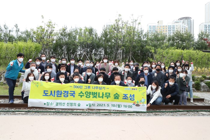 유동균 마포구청장이 지난 10일 경의선 선형의 숲에서 개최된 '수양벚나무 숲 조성' 행사에 참석했다. 사진은 행사에서 유 구청장(앞줄 가운데)이 참석자들과 기념촬영을 하는 모습. (사진제공=마포구청)