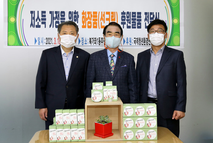 서울 서대문구는 최근 사단법인 국제청년환경연합회로부터 북가좌1동 취약계층 주민들을 위한 화장품(선크림·선쿠션) 1000개를 기부받았다. 사진은 전달식에서 윤유현 서대문구의원, 정무신 (사)국제청년환경연합회장, 유병선 북가좌1동장이 기념촬영을 하는 모습. (사진제공=서대문구청)
