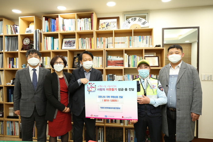 서울 구로구에 외국인 주민이 5년간 모은 돼지저금통을 기부하는 등, 성금·성품 후원 행렬이 이어지고 있다. 사진은 이성 구청장(왼쪽 세 번째)이 코로나19 극복을 위해 물티슈 1500개를 전달한 한중다문화깔끔이총연합회와 함께 기념촬영을 하는 모습. (사진제공=구로구청)