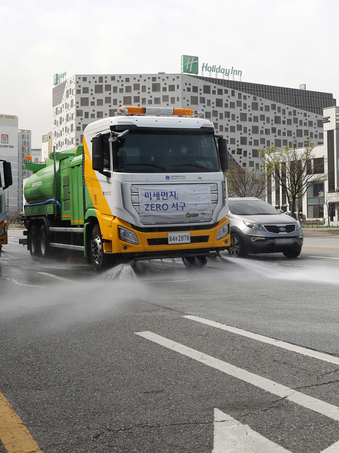 극심한 미세먼지가 이어진 30일 오전 광주 서구 한 도로에서 미세먼지 비상저감조치의 일환으로 살수차가 물을 뿌리고 있다.