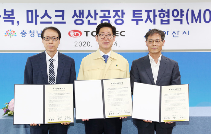 최근 충남 아산시가 (주)톱텍, 충남도와 도청에서 마스크 생산 제조설비 구축투자 MOU를 체결했다. 이날 협약 체결 후 (주)톱텍은 아산시에 마스크 5만장을 기부했다. 사진은 협약 후 기념촬영을 하고 있는 관계자들의 모습. (사진제공=아산시청)