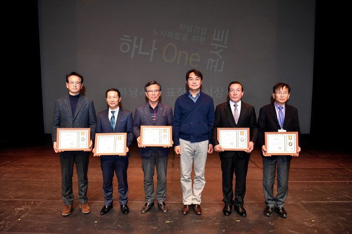 경기 하남시가 주관하고 하남시기업인협의회가 주최한 ‘하남기업 노사가 함께하는 하나-one 콘서트’가 20일 하남문화예술회관 아랑홀에서 개최됐다. 사진은 김상호 시장(오른쪽 세 번째)이 모범기업인들과 함께 기념촬영을 하는 모습. (사진제공=하남시청)