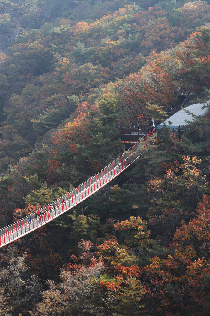 28일 경기 파주시 감악산에서 등산객들이 단풍을 즐기며 출렁다리를 건너고 있다.