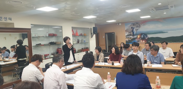 경기 김포시가 최근 민방위재난실전훈련센터에서 공공사례관리 기관의 복지서비스 개선을 위한 간담회를 열었다. 이날 간담회는 정신건강복지센터, 장애인복지관 등 9개 기관과 읍·면·동 관계자 등 40여명이 참석한 가운데 진행됐다. 사진은 회의 진행 모습. (사진제공=김포시청)