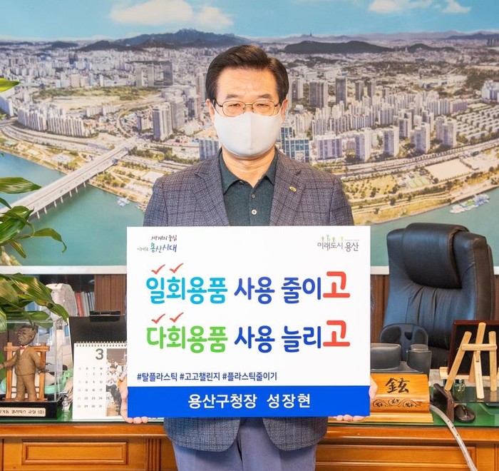 성장현 서울 용산구청장이 17일 코로나19로 사용량이 급증하고 있는 일회용 플라스틱 사용량을 줄이기 위해 ‘탈(脫)플라스틱 고고챌린지’에 동참했다. 사진은 성 구청장이 ‘일회용품 사용 줄이고, 다회용품 사용 늘리고’라고 적힌 판넬을 들고 ‘탈(脫)플라스틱 고고챌린지’에 동참하고 있는 모습. (사진제공=용산구청)