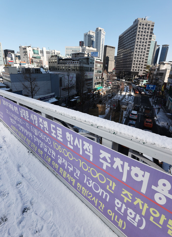 설을 맞아 서울시는 5일부터 오는 14일까지 기존에 무료 주·정차가 가능한 38개 시장 외에 추가로 59개 시장의 주변 도로 주·정차를 최대 2시간까지 허용한다. 해당 시장 명단은 서울시 홈페이지에서 확인할 수 있다. 사진은 4일 서울 남대문시장 인근에 설치된 현수막.