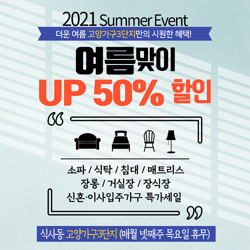 [시민일보 = 이승준 기자] 일산가구단지 고양가구3단지는 여름을 맞이하여 신혼 입주가구를 준비하는 이들에게 합리적으로 구입할 수 있는 ‘여름맞이 Cool한 할인행사’를 진행한다고 밝혔다.