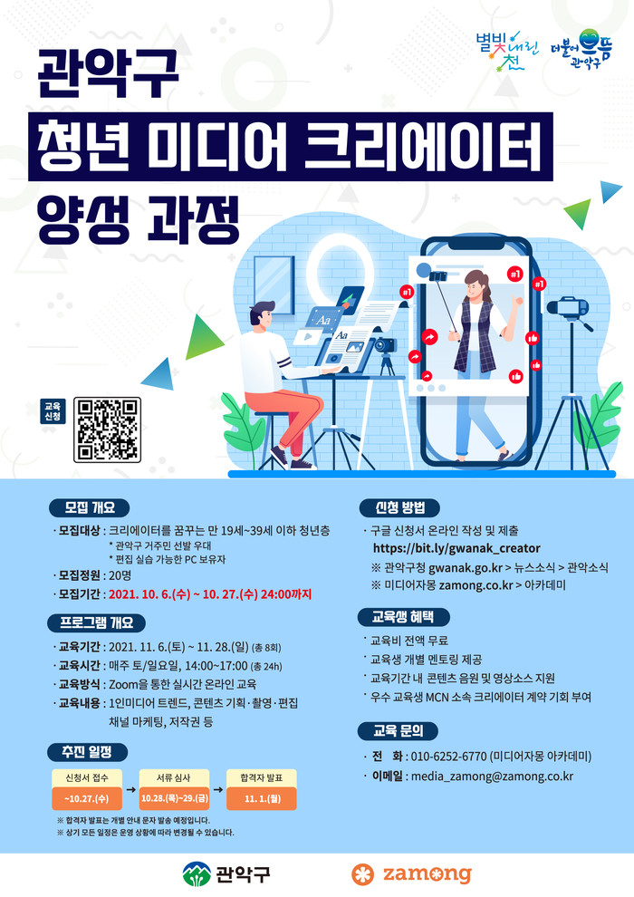 [시민일보 = 여영준 기자] 관악구(구청장 박준희)는 오는 11월6~28일 크리에이터를 꿈꾸는 청년들을 위한 ‘청년 미디어 크리에이터 양성 과정’을 운영한다고 밝혔다.