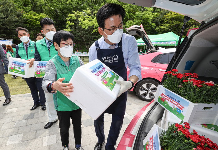 어버이날을 이틀 앞둔 6일 오전 박성수 서울 송파구청장(오른쪽)과 송파구 새마을 부녀회 관계자들이 서울 송파구 오금공원에서 어버이날을 맞이해 지역내 홀로 거주하고 있는 노인들에게 전달할 김치를 포장한 뒤 카네이션과 함께 배달하기 위해 차량에 싣고 있다.