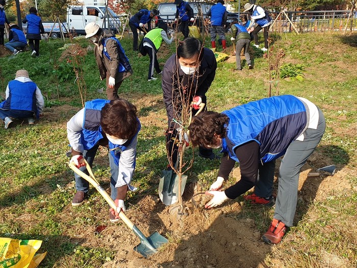 경기 의정부시 송산3동은 그린 뉴딜사업의 일환으로 26일 송산3동 도시 숲 '어울림(林)'을 조성했다. ‘어울림’은 송산3동 통장협의회에서 실시하는 자생단체 뉴딜 특화사업으로 송산3동 통장 57명이 참여해 지역내 용민로, 민락로 일대 810m 구간에 칠자화 250주, 배롱나무 50주를 식재했다. 사진은 참여자들이 나무를 심고 있는 모습. (사진제공=의정부시청)