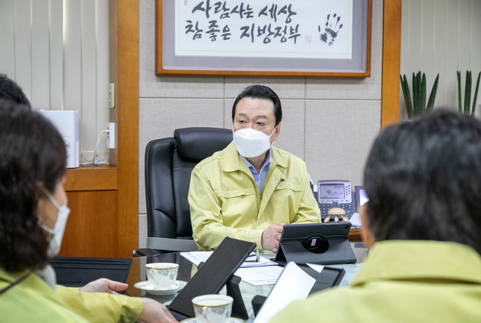 서울 강서구는 9일 ‘코로나19 백신 예방접종 대책회의’를 열고 추진상황을 점검했다. 이날 노현송 구청장은 백신 접종센터 설치 준비현황 등 접종 준비사항을 전반적으로 점검하고 백신 예방접종 전반에 걸쳐 필요한 사항을 세심히 살폈다. 사진은 이날 노 구청장이 대책회의를 주재하고 있는 모습. (사진제공=강서구청)