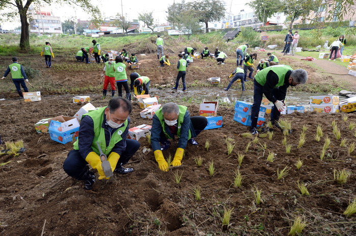(사)자연보호경기도오산시협의회가 최근 오산천에서 수질정화활동을 전개했다. 이날 협의회 회원 50여명은 상류에서 흘러오고 버려진 쓰레기를 수거하고, 물억새와 창포 및 수크령 5000본을 식재하는 등 '오산천 작은정원'을 새롭게 단장했다. 사진은 이날 봉사자들이 물억새 등을 심고 있는 모습. (사진제공=오산시청)