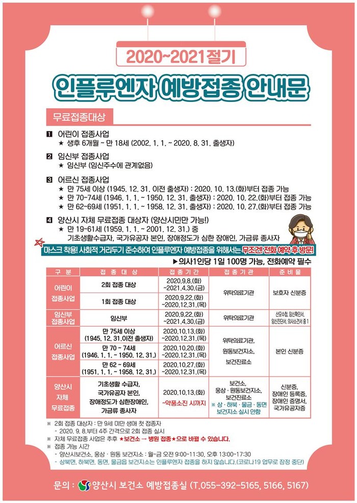 취약계층 대상자인 기초생활 수급자, 장애정도가 심한 장애인, 셋째아 이상 다자녀 가정의 만 14~18세 자녀, 국가유공자 본인, 가금류 종사자는 10월 25일부터 백신 소진시까지 무료 인플루엔자 접종을 보건소, 웅상·원동보건지소, 화제·선리보건진료소에서 실시한다. 접종을 위한 필요서류는 기초생활수급자 증명서, 장애인 등록증, 국가유공자증, 주민등록등본(다자녀가정)이다.