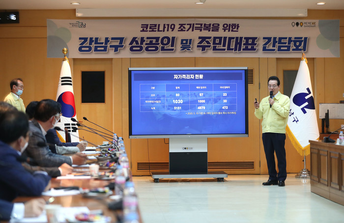 강남구는 11일 구청 3층 회의실에서 강남구 체육회와 함께 코로나19 조기 극복 의견을 청취하고 이에 대한 구의 지역 살리기 대응책에 관해 설명하는 간담회를 개최했다. 사진은 정순균 구청장(오른쪽)이 자가격리자 현황에 대해 설명하는 모습. (사진제공=강남구청)