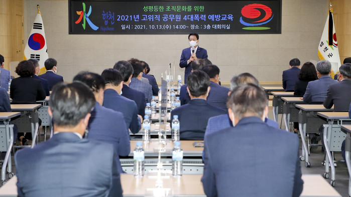 합천군(군수 문준희)은 13일 군청 3층 대회의실에서 문준희 군수를 포함한 5급이상 고위직 공무원 47명을 대상으로 ‘2021년 고위직 공무원 4대폭력(성희롱.성매매.성폭력.가정폭력) 예방교육’을 실시했다.