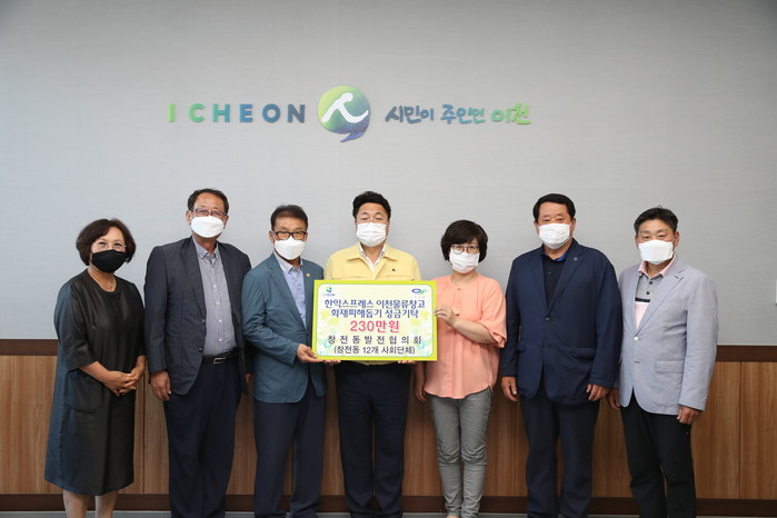 경기 이천시 창전동 발전협의회가 ‘한익스프레스 이천물류창고 화재’ 피해자들을 위해 12개의 창전동 사회단체들이 모은 230만원의 성금을 엄태준 시장에게 전달했다. 사진은 성금을 전달받은 엄 시장(가운데)과 창전동 발접협의회원들의 모습. (사진제공=이천시청)