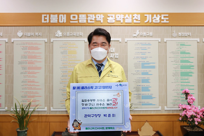 박준희 서울 관악구청장이 9일 일상 속 일회용품과 플라스틱 사용을 줄이기 위한 탈(脫) 플라스틱 실천 운동인 ‘고고 챌린지’에 동참했다. 사진은 박 구청장이 탈 플라스틱 챌린지에 참여하고 있는 모습 .(사진제공=관악구청)