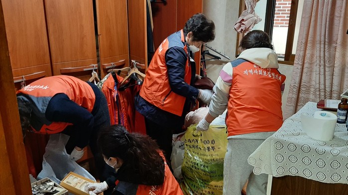 현대제철 인천공장 봉사단인 다물단은 인천 동구 화수1·화평동 지역사회보장협의체와 함께 지난 27~28일 동 지역내 치매노모과 함께 사는 모자가구를 대상으로 집안 대청소 및 도배·장판 교체 등 집수리 봉사활동을 전개했다. 사진은 지난 27일 협의체 회원들이 집안 대청소를 하고 있는 모습. (사진제공=동구청)
